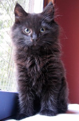 Svart semilanghåret kattunge med sølvsjær i pelsen.