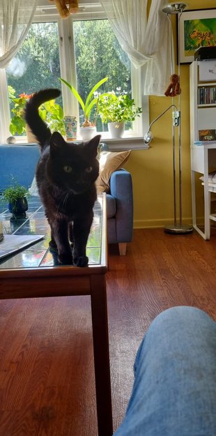 Noen få hvite hår på brystet, nesten ikke synlig. Et bakbein som er litt skeivt. Men ingen halting. Ganske tynn og rask. Gule øyne.