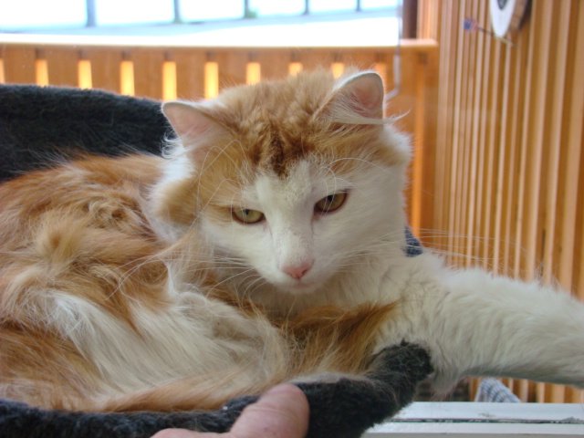 timian er delvis langhåret, orange og hvit. id merket og chipset og kastrert. han er 2 år gammel og han er veldig kjælen. veldig lange værhår.