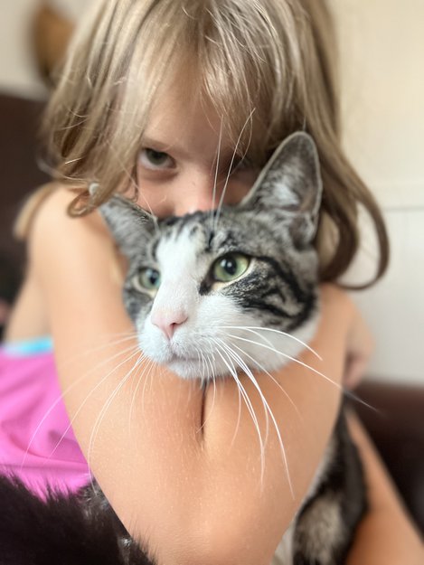 Hvit stripe i ansiktet. Veldig sosialt og kosete. Hvitt bryst. Svarte flekker under på potene.
