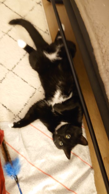 Han er stort sett svart men har hvite sokker, hvitt på mage og halsen. Og har ett hvitt værhår. Stort sett redd for alt lyd og broken. Gjerne send melding før du ringer hvis du har funnet.
