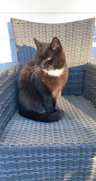 Svart hannkatt, tynn og lang, hvit på halsen og på alle potene. På 2 av de er han bare hvit under