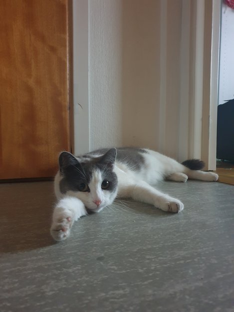 Liten hvit og grå katt. Grå på ryggen og bakbenet, hvit under.