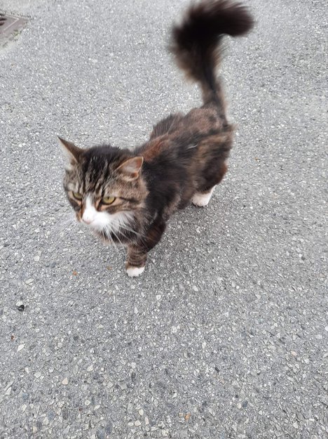 Jeg møtte på katten 2 dgr på rad skrikende og kontaktsøkende. Jeg fant verken bånd, annen merking eller synlige skader. Jeg har imidlertid ikke videre greie på det. Men jeg syns dem så pjusk og tynn ut. Fikk vondt av den.