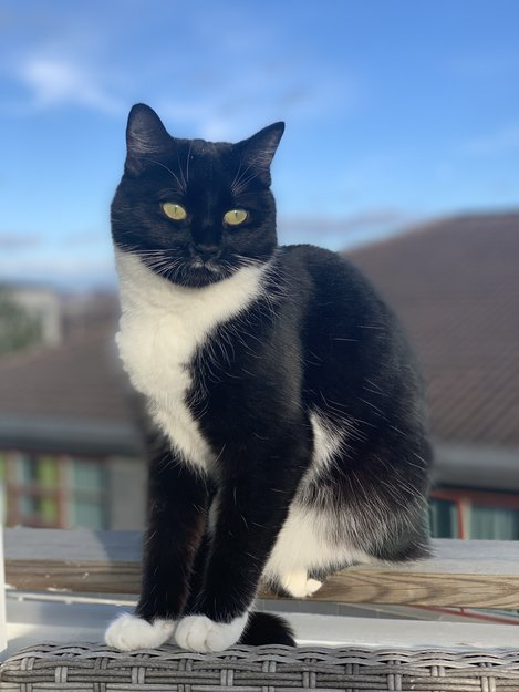 Svart katt med hvite poter og hvit på magen. Har en hvit liten «melkebart» over leppen. Er liten av størrelse og veldig sprek.