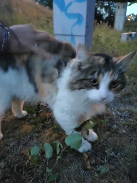 Hvit katt med grå, brune og noen svarte striper på ryggen, oppå og sidene av hodet. Veldig kosete men lettskremt, pelsen er lang, ser ut som katten har et hjem for det var ingen floker i pelsen