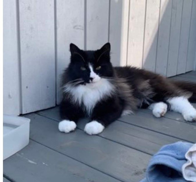 Sort og hvit hannkatt på ca 4år. Lang pels, er kastrert, øremerket og chippet. Veldig menneskesky og nesten umulig for andre å komme innpå. Han er sort/brun, mest brunskjær i sola. Gråaktig pels på sidene. Snuten har todelt farge (sort/rosa). Hvit stripe på snuta og hvit på poter og mage.