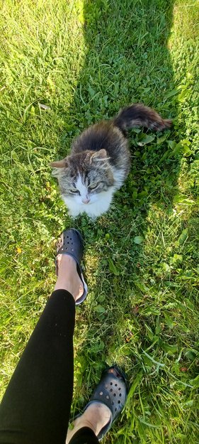Tam og kosen ,ustelt tynn katt dukket opp hos meg, kjønn ukjent, uchippet.