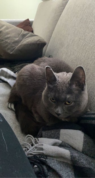 Grå med hvit flekk i brystet og magen. Hakk i høyre øre. Spesiell krøllhale. Gulgrønne øyne