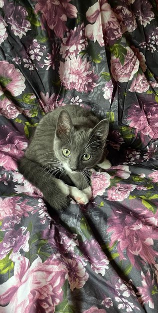 Katten er grå i pels, med delvis hvit farget under føttene og nakken/hals.
