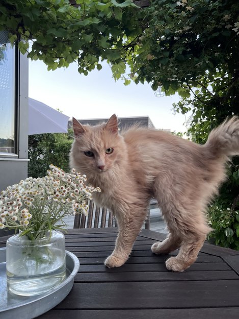 Veldig kontaktsøkende og kjælen. Tynn og mye klump i pelsen.