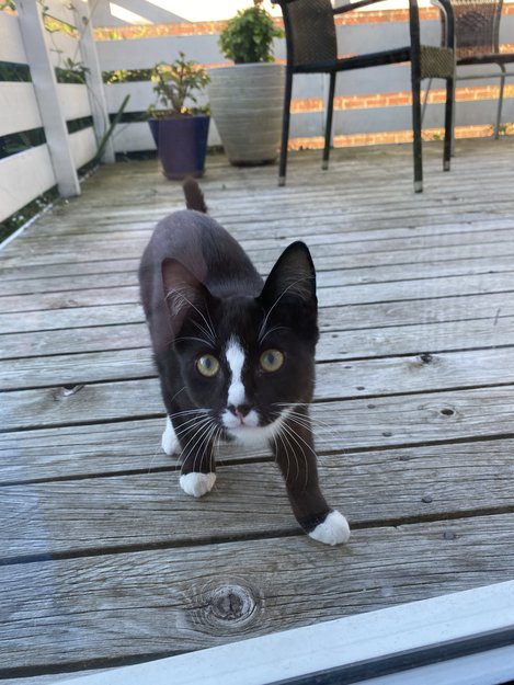 Liten ungkatt, mjauer og vil inn. Tipper den er ca et halvt år