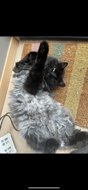 Silver er svartsmoke. Sølvfarget på kroppen. Løveklippet. Har lang pels, men har kort akkurat nå på kropp.