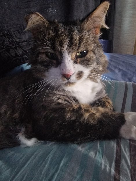 Har en 'føflekk' på venste kinn og halvannet øre. Høyre øre er halvt. Er egentlig langhårs men er nedklippet pga sommeren. Nb. Katten er FIV smittet.