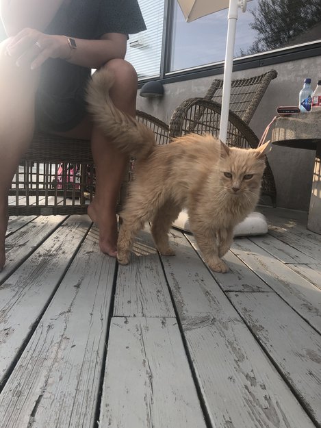 Denne fine, veldig kosete katten kom på besøk til hytten vår i Østhusvik søndag 14. august 2022. Den har vært på besøk hos andre på hyttefeltet i minst én uke før det. Katten er nokså pjuskete i pelsen (tynn pels flere steder, mange floker og gress i pelsen) og litt tynn. Vi lurer på om den kan ha gått seg bort? Katten er veldig tam og kontaktsøkende, så vi tror den tilhører en familie.