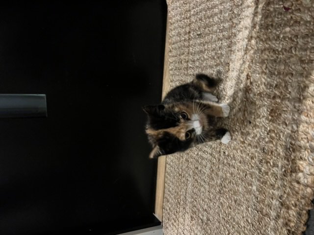 Kattunge, uviss alder, men virker å være under 12 uker? Flerfarget, med hvite poter.