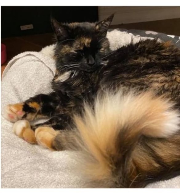 Ikke sett den siden tirsdag 9. august. Hun har katteluke og går normalt inn og ut selv. Hun er ikke kippet men er sterilisert. Hun er veldig tam og liker kos.
