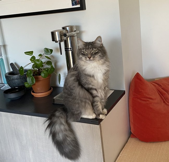 Langhåret, gråstripet med hvitt bryst, mage og poter. Svært stor og fløffy hale. Skeptisk til nye ukjente, men blir raskt mer tillitsfull. Ca 3 kg.