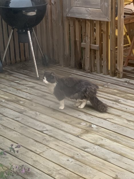 Denne katten går rundt i området her og ser ikke ut til å ha et ordentlig hjem. Tynn og dårlig pels. Noen som kjenner til eier?