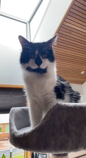 Langhåret, Ca 4.5 kg, sort nese og skvetten og skeptisk til fremmede.