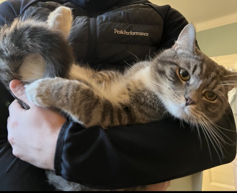 Han er gråstripete, men kvit under og på labbane, og har eit stort operasjons-arr på buken. Han er ein nokså trygg og sosial katt, vil eg seie. Han kjem ofte inn når eg ropar på han, og vil gjerne ha kos også når han møter oss ute.