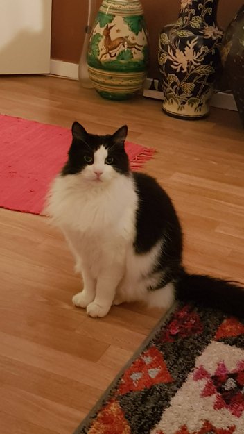 Han er svart og hvit langhåret pels..ikke noe veldig spess med han. Han er bare gopusen min..