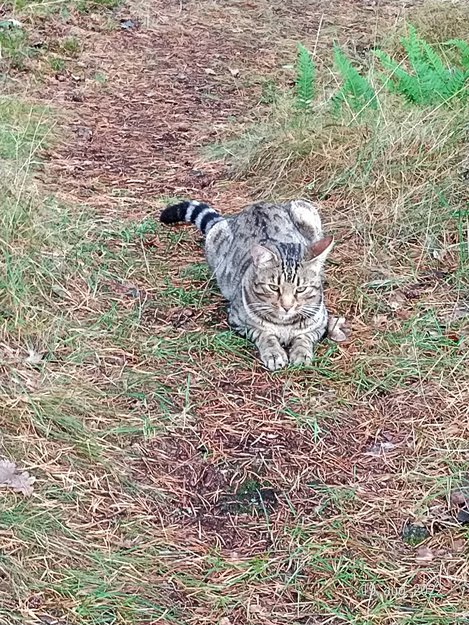 Kvelden til 18/08 kom katten løpende til oss og tigger på mat. Katten ser tynn ut. Den ser nervøs ut og trekker seg fra oss hvis vi vil ta på den. Han fikk mat og vann og flåtten på kroppen ble fjernet.