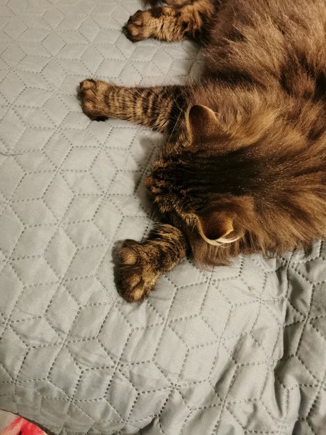 Fluffy, grå, polydaktyli (har tomler). Ganske liten (kort).