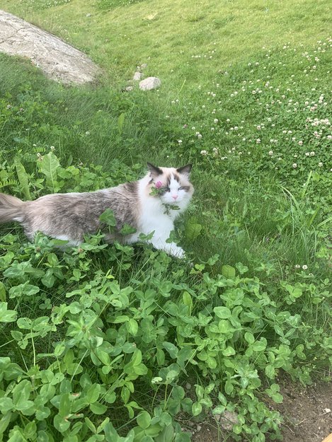 Pus har halsbånd med bjelle på og navnet hennes og kontakttlfnr til eier. Hun er sjy, men veldig snill. Kan løftes på.