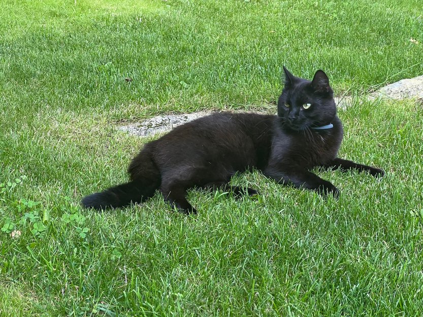 Katten har noen få hvite hår på brystet. Den har på flåtthalsbånd.
