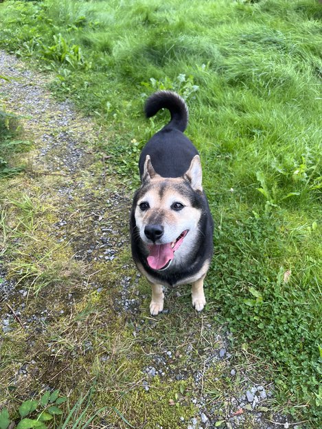 Tispe med spisse ører og krøll på halen. Kan se ut som en type blandingshund. Fargene hennes er svart, brun og beige/hvit. Kanskje noe overvektig