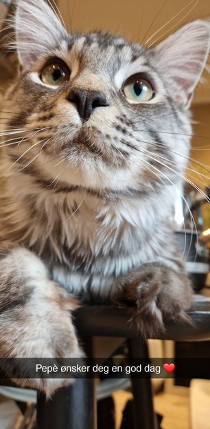 Ukastrert hannkatt, halen ser ut som en stor støvkost. Han er stor, selv om han er kattunge fremdeles. Mørk over ryggen, hvit på magen og stripete på hodet.