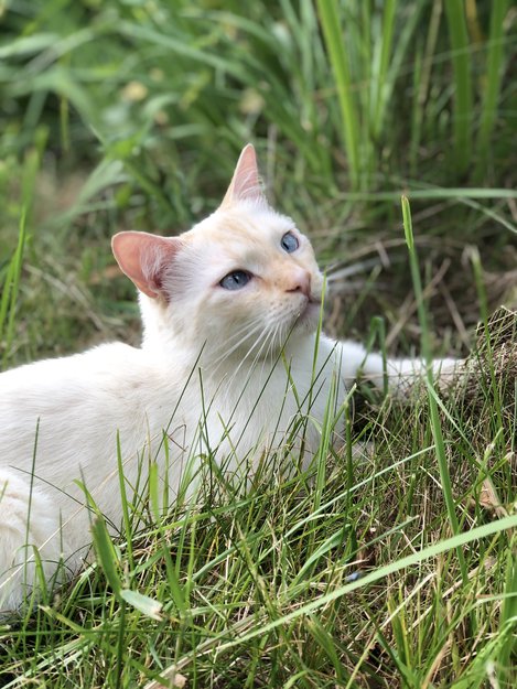 Hvit, med noen beige tigerstriper på halen. Noe beige i ansikt og på ører. Knall blå øyne. Ekstremt kosete dersom han føler seg trygg, og veldig nysgjerrig.