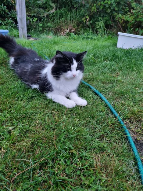 Se bilde. Vil legge til at denne katten er velpleid og chippet, med tatovering i øret. Totoro er en kjær familiekatt som er noe skeptisk til fremmede. Han vil neppe komme bort for å få kos eller oppmerksomhet. Han er hvit på haletuppen. Ring Bård på 97125624 ved observasjon!
