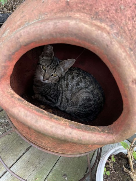 Kjempe tynn kattunge, kjempe sulten så vi har gitt den mat og tak under hodet midlertidig. Den er kjempe redd for menneske kontakt.