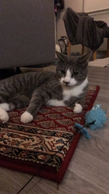 Alvin er grå tiger / makrell. Han har hvite poter/hvite sokker og en hvit manke. Han hilser gjerne på om man puser eller roper på Alvin.