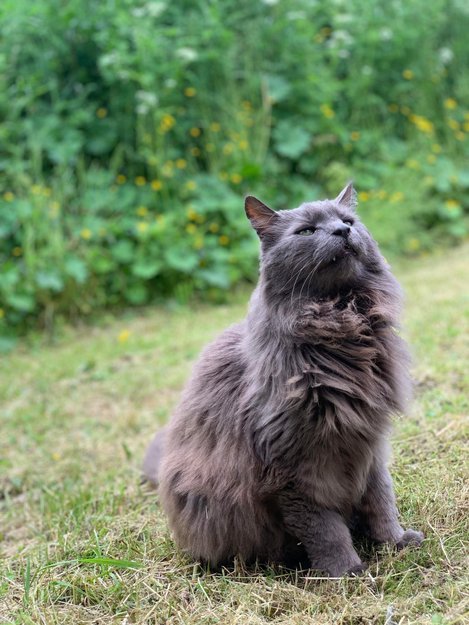 Helt grå, lang pels. Gule øyne som han vanligvis har halvåpne, så han har et smalt blikk.
