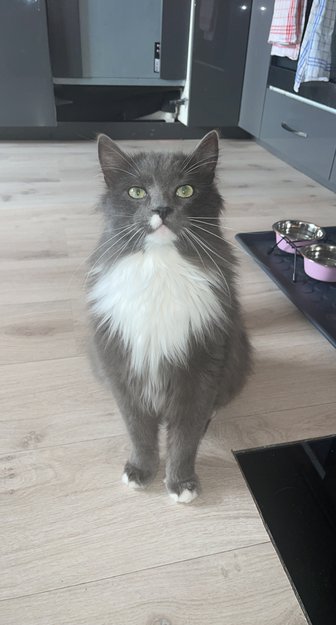 Kenai er en grå langhåret katt med hvite kjennetegn på hals/bryst og hvite tegn på poter. Han er 2 år gammel.