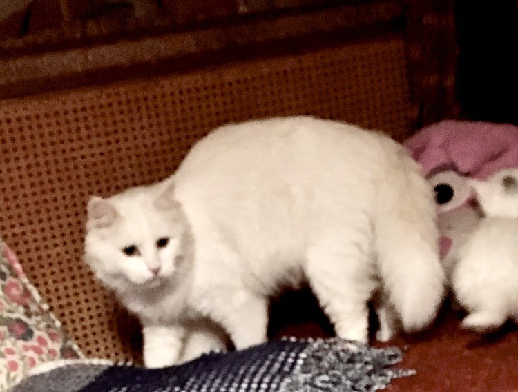 Hun er helt hvit med lang pels spesielt på halen. Hun har en flipp i hvert øre etter slosseskade for noen år siden. Grønne store øyne og veldig kosete. Mulig gravid.
