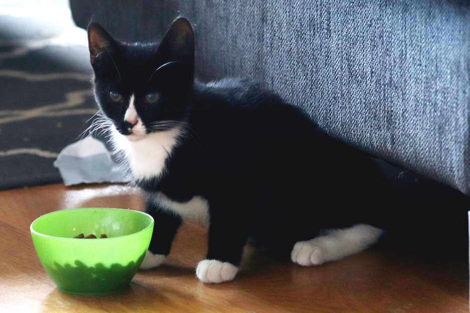 Liten og ung pus, 10 - 12 uker? Sort med hvite sokker på forlabbene og lange hvite sokker på bakbeina. Hvit tegning/stripe i ansiktet. Hvitt bryst og mage. Lys nese.