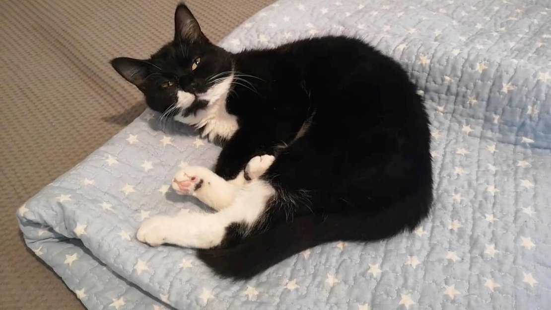 Gudrun er ganske liten. Hun er mest svart, men hvit på halve kinnet og nedover halsen og på magen, og på potene. På bakpotene har hun ganske høye hvite sokker.