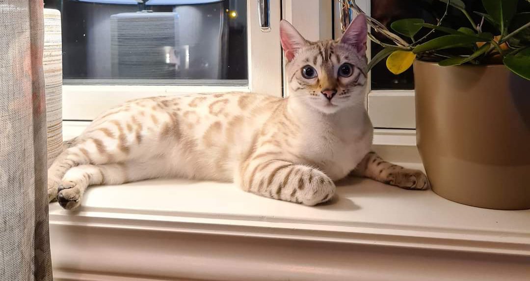 Esme er lys hvit i pelsen og har mørke spotter som prikker. Hun har stripete hale og nesten blå øyne . Hun er 14 mnd og ercrask i bevegelsene som en kattunge ge. Hun er smal og graciøs