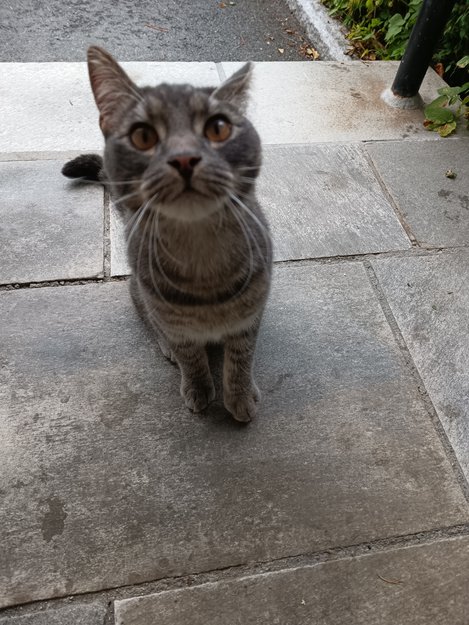Katten var ute og vandret. Ville ha kos og klem. Virket veldig trygg, velstelt, glad og fornøyd. Fulgte etter meg hjem og ville bli med inn. Den virket opptatt av å komme seg inn i andre oppganger også.