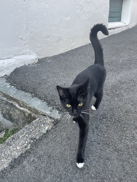 Svart og hvit kattunge går rundt i gaten og mjauer og søker kontakt. Gjetter den kan være 4-6 mnd gammel.