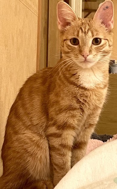 Liten oransjestripete hokatt. Hvit flekk på brystet, rosa snute, tatovering i venstre øre.