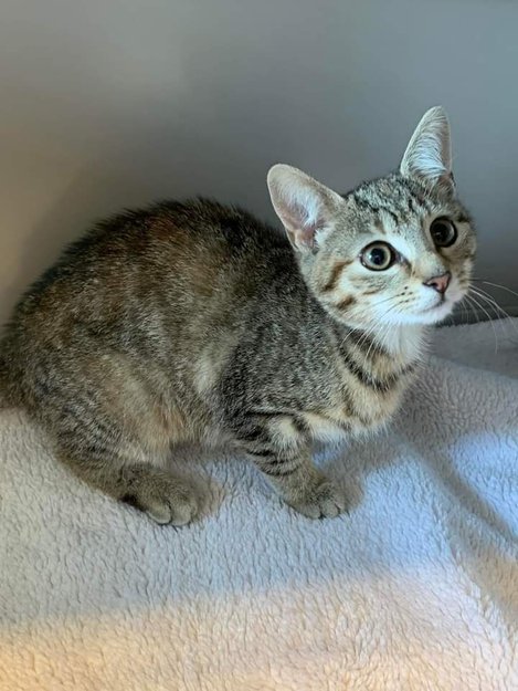 Hunnkatt på ca 3 mnd. Er ikke id-merket. Hvitt ansikt og bryst, svart og brun stripete hale.