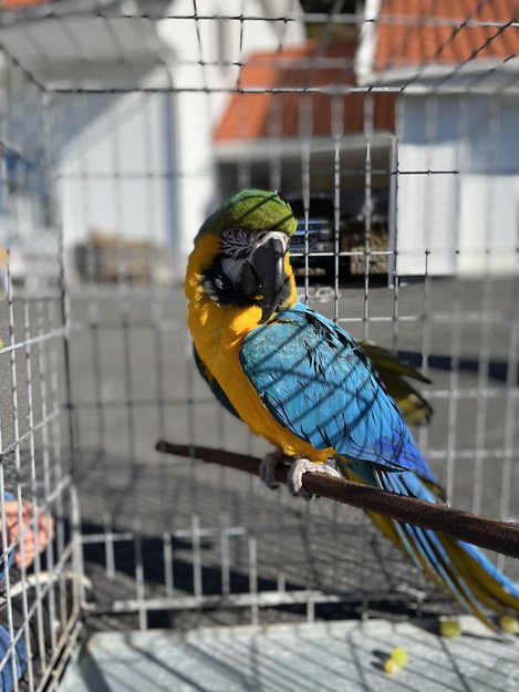 Ara pappegøye satt på taket. Ble tatt ned, og ble satt i bur, i tilfelle skader. Fikk mat og vann.