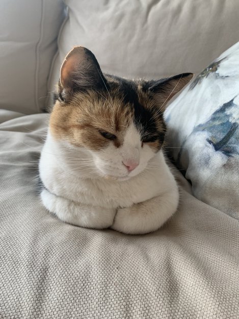 Voksen, forsiktig pus. Ca 8 år gammel. Mjauer lite, engstelig for fremmede. Ekstremt kosete når hun er trygg.