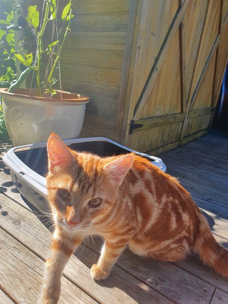 Bemerkelsesverdig mønster, sirkel/spiral på sidene, striper langs ryggen, prikker på magen, giraff-mønster på skuldrene. Ikke rasekatt.
