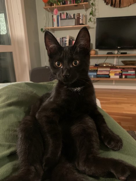 Sort 7 måneder gammel hannkatt. Slank. Har en hvit flekk øverst på brystet(nederst på halsen). Kan nok virke veldig redd, da han ikke har vært så mye ute enda.